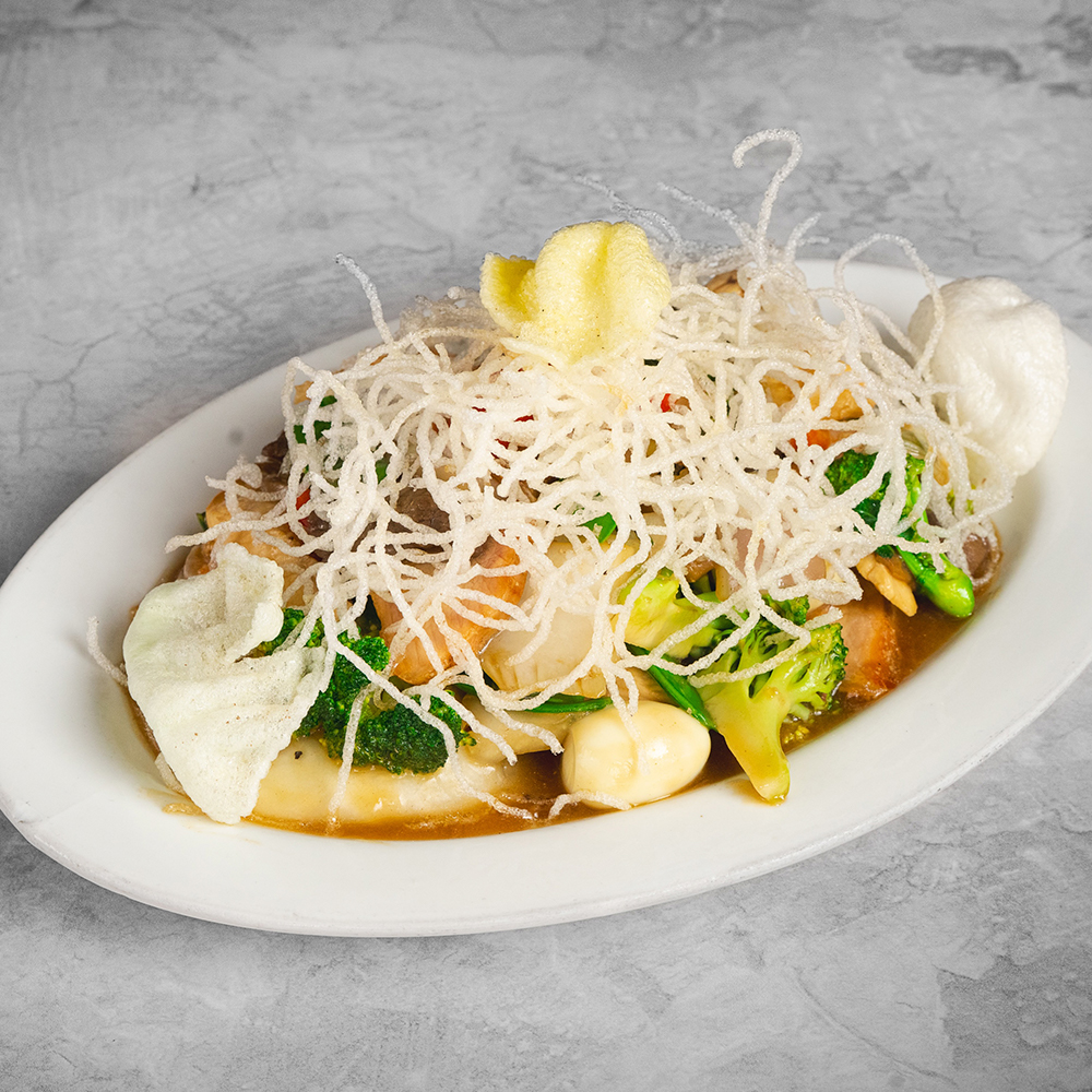 Pollo, cerdo, pato, langostino, verduras